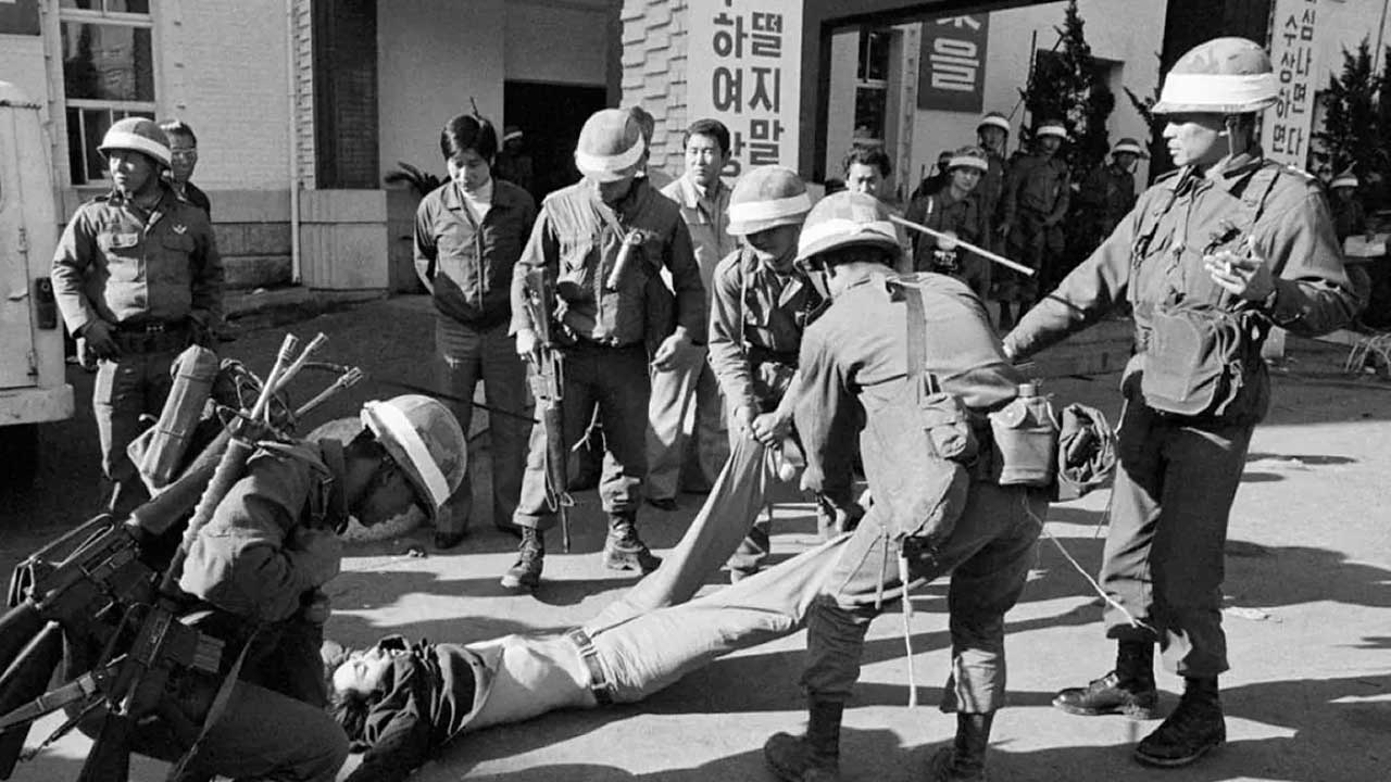 Varios soldados arrastran a un manifestante tras la masacre de Gwangju en 1980.