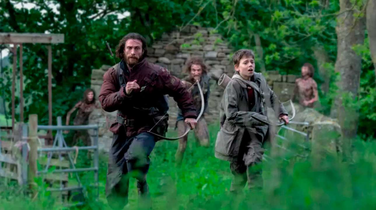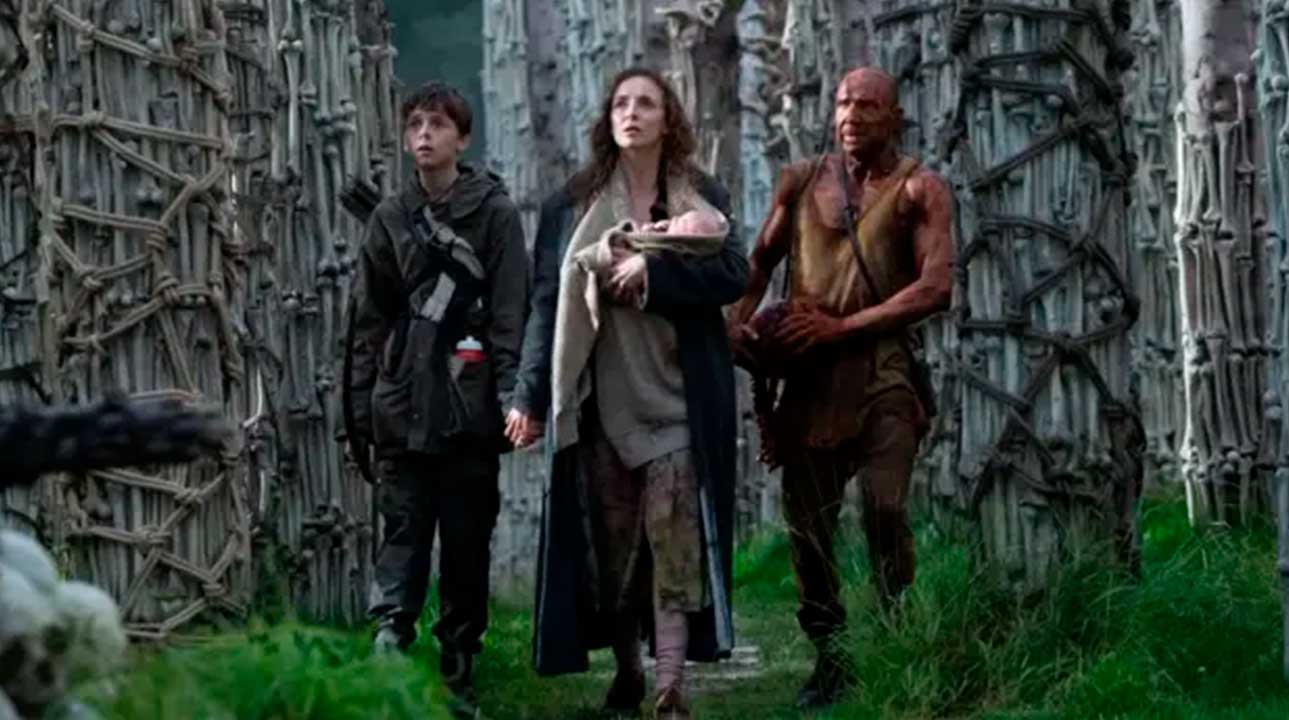 Grupo de supervivientes camina entre estructuras óseas en un entorno postapocalíptico en la película 28 Años Después.